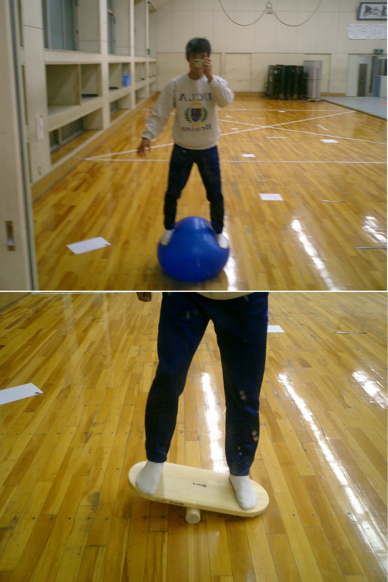 冬場は、バランスボール、バランスボードを使ったトレーニングを行っています。バランス能力はすべてのスポーツに必要なもので、もちろん陸上競技にも大事なものですが、スキーにおいては最重要な能力です。ボールの上に立ったりもしています。