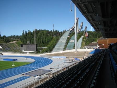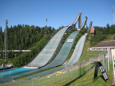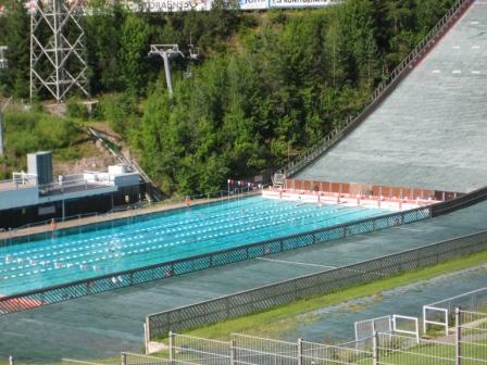 競技場のすぐ横にジャンプ台があります。さすが北欧!ジャンプ台の着地地点にはプールがありました。