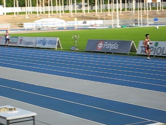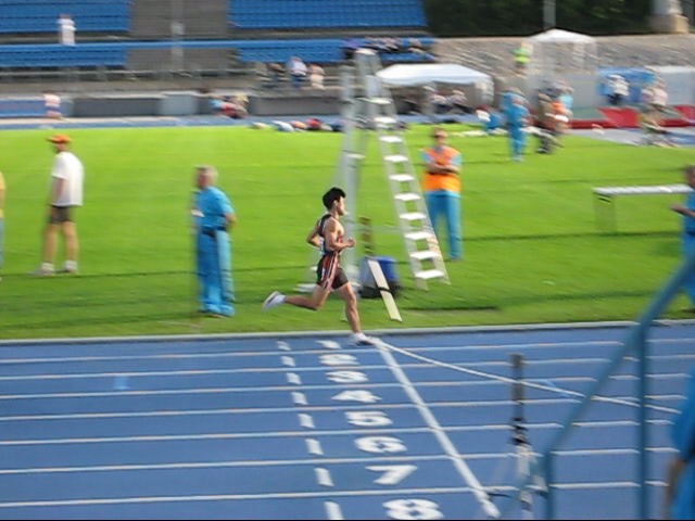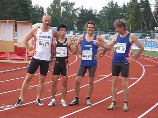 1周目、早くも100mで先頭に立ちました。「1500mもトップをとるぞ!」。400m通過75秒、2周目いよいよ独走になり、800m2分35秒(2周目80秒)、場内放送でもさかんに「マサヒロイケノがトップだ」と言ってくれています。うれしいですね。3周目のラップも80秒で、1200m3分55秒で通過。ラストスパートをかけるも、足が上がらず、かつ「もうこれで銅メダル確定?」と甘い気持ちになり、余力を出し切れず。ラスト300m59秒かかり、中途半端に疲れて、1位でゴール。