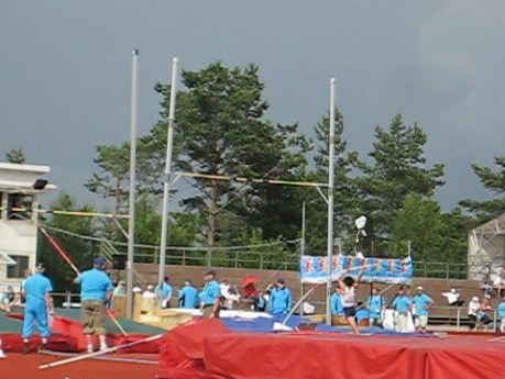 いきなり風向きが変わり、向かい風に。やむなく助走を30cm短くしてスタートしましたが、案の定、棒が立たず、アップライト60cmではきびしく、ぎりぎりのクリアーでした。