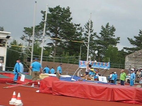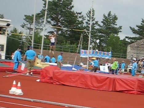 自己新を出して、疲労を考えると、もう充分なところですが、長年目標としていた4m00に挑戦の初めての機会です。勝負は度外視しても、調子に乗って挑戦します。場内放送も「マサヒロ・イケノが4mに挑戦するぞ」と言っています。