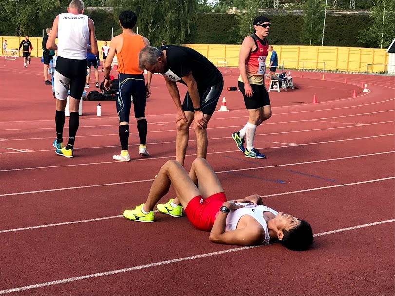 悪夢は再び乳酸系でやってきました。大の得意の400mH、しかし昨日のように気合を入れすぎずリラックスして余裕を持ち、65秒あたりで走れればいいかと自重。それでも70秒以下で走れれば種目別世界記録だと言い聞かせてスタートに立ちました。少しふくらはぎが張っているので大丈夫かな。