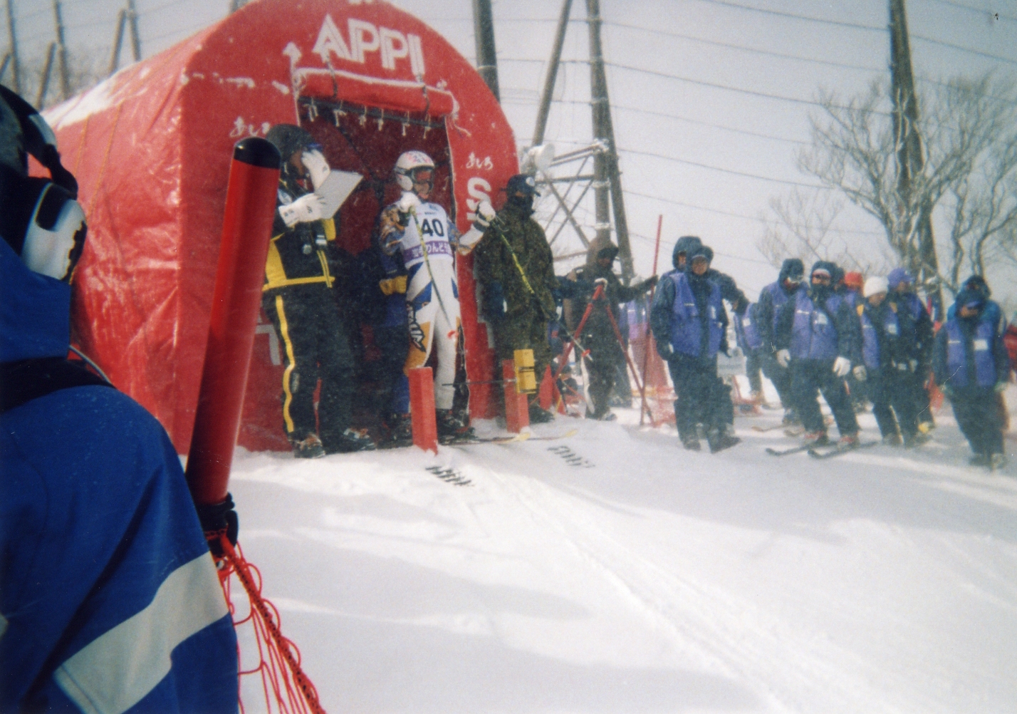 ついに出番がやってきました。昨夜も大雪でバーンはフカフカですが、日差しがさしてきました。40番スタートですが女子Aに続いて行われるのでコースは荒れ荒れです。風が強くて競技の進行が遅れています。スタート前にはコーチからの指示があったり、監督の大倉先生がスタート小屋まで板を運んでセットしてくれたり、いたれりつくせりで、一流選手になった気分です。スタッフのみなさんありがとうございました。