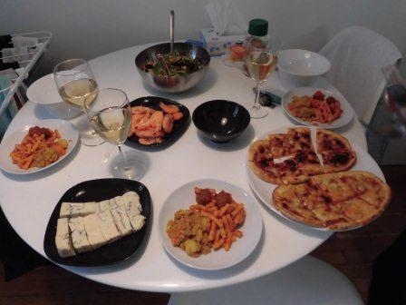 夕食、ワイン、ピザ、エビ、チーズ、サラダ