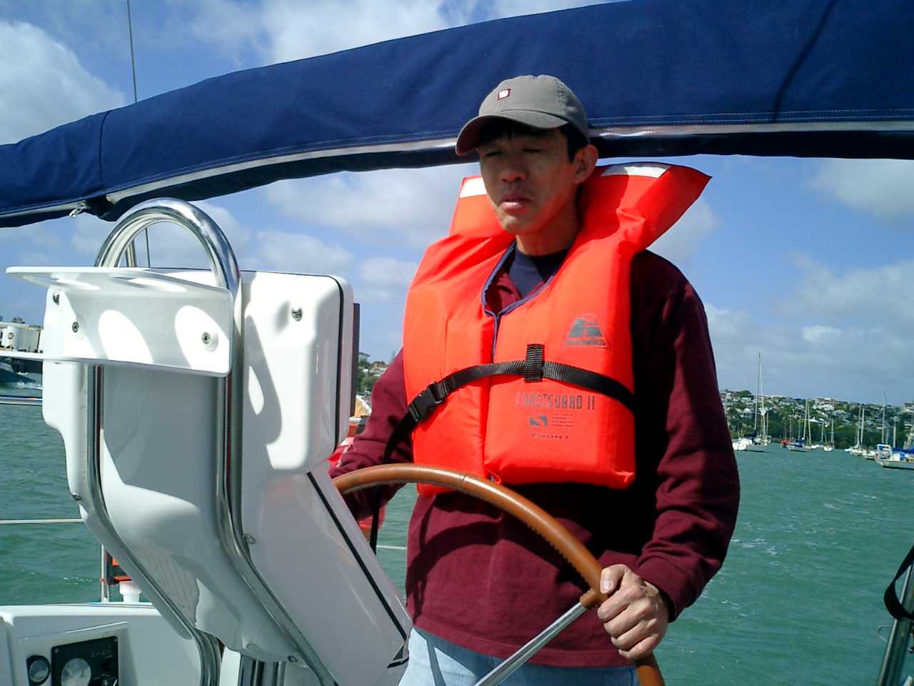 港の中はゆっくりエンジンで進みます。そしていよいよ帆を広げロンが言います「レッツ、セイリング!」。行きは追い風を受けて順調に進んで行きます。最初ロンが操縦していましたが、しばらくすると「マサ、チェンジ」と言われ私が操縦することになりました。操縦といっても、アクセルもブレーキもなく車のハンドルみたいな操舵桿を持っているだけです。ヨットがまっすぐ進むように微妙に左右に動かすだけです。でも船長になった気分で爽快です。
