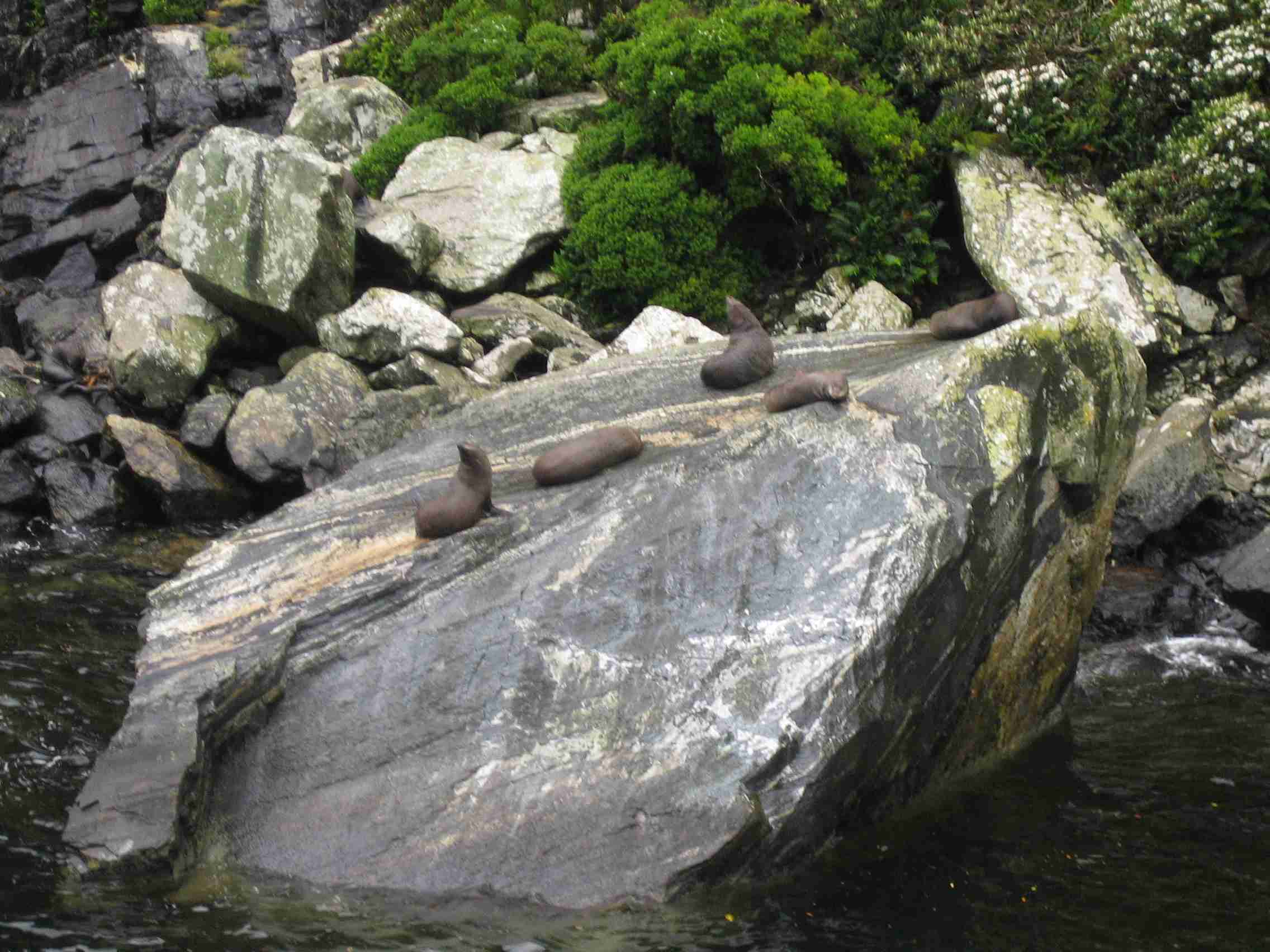 フィヨルド内から外海のタスマン海に出て行くと波が強く船も揺れましたが、すぐに引き返したので酔って気分が悪くなることもありませんでした。ペンギンやイルカは見れませんでしたが、お決まりのアザラシの休憩所には、たくさんのアザラシが岩に乗っていました。こうして1時間40分のクルーズは終了。
