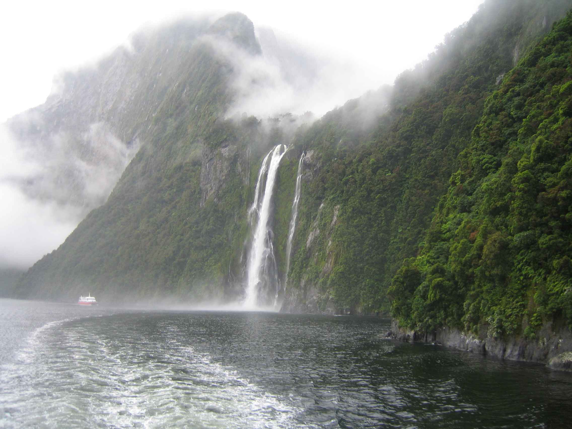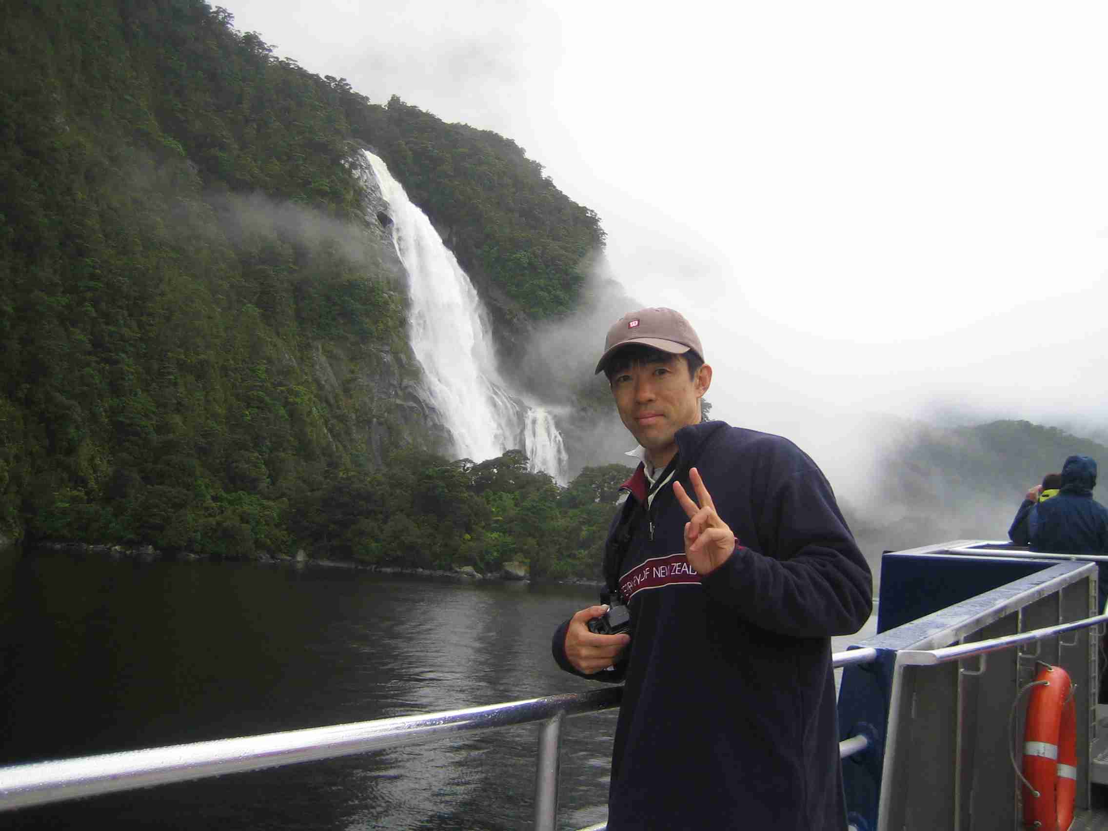 クルーズは順調に進み、霧の中、中国の水墨画のような風景が続きます。残念ながら、絵葉書にあるようなマイターピークは見ることはできませんが、流れ落ちてくる滝は壮大です。