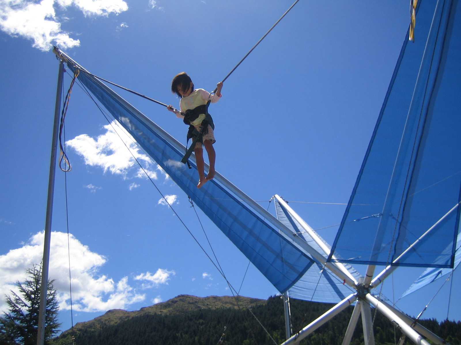 気がつけばもうお昼になっています。街の方へ歩いて向かっていると、バンジートランポリンが!これは、バンジージャンプ用のロープを体に結んでトランポリンをする遊びです。愛が「やる!」と果敢に挑戦しました。望は結局せずにそれがずっと心残りだったそうです。