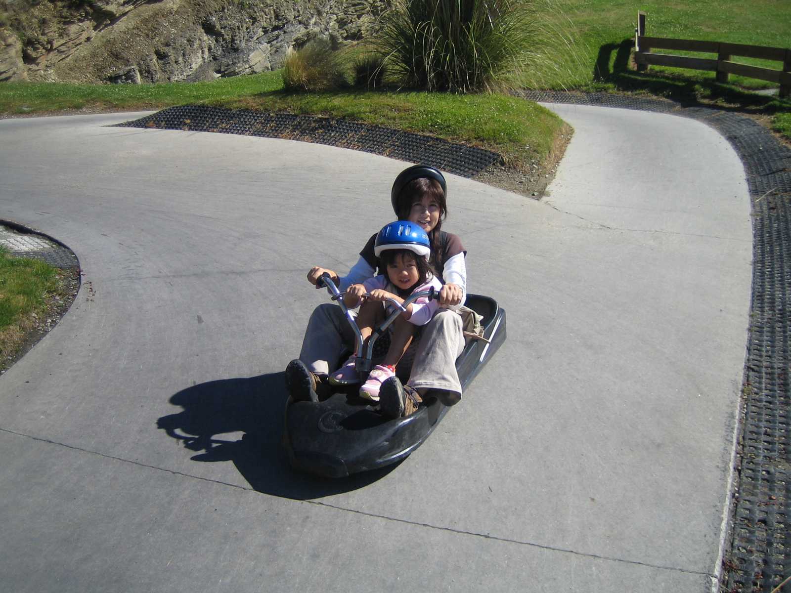 そしてお楽しみのリュージュに乗りました。ヘルメットをかぶり、そりに乗ってコースを滑り降ります。そりには、一人乗り用と二人乗り用があり、コースも初心者用と上級者用の2コースあります。