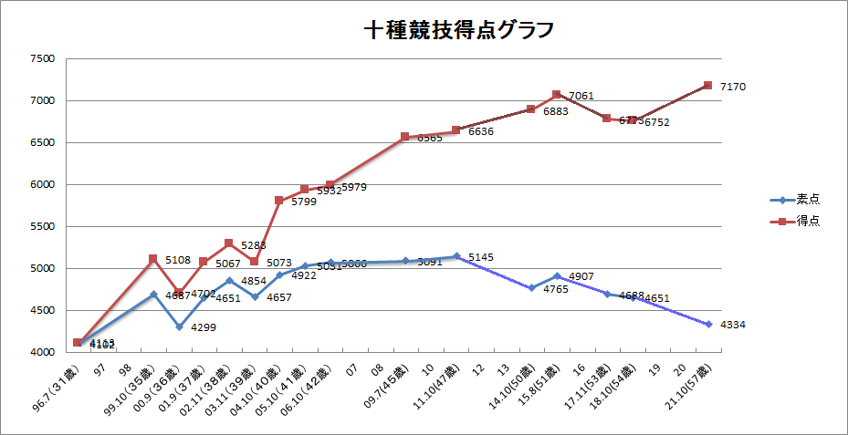 | 2000年9月 | 大阪府服部 | 36歳 | 4702 | 4299 | 12.35 | 5.14 | 7.85 | 1.55 | 56.36 | 18.60 | 23.45 | 3.00 | 33.14 | 5.15.75 | スキーでの肋骨骨折の影響か、10種目すべて昨年より悪い最悪の年でした |