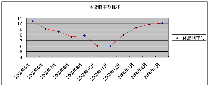 | 体脂肪率(%) | 10.4 | 9.1 | 8.6 | 7.7 | 7.9 | 6.0 | 6.0 | 8.0 | 9.3 | 9.9 | 10.1 |