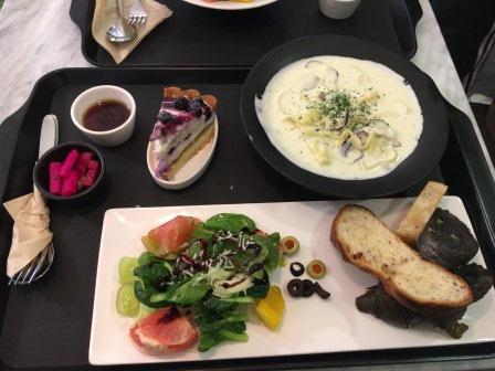 今日の夕食は、近所をウロウロしたあげく、韓国料理の店は韓国語しか書いていなくて敷居が高く、カフェでパスタセットを頼みました。